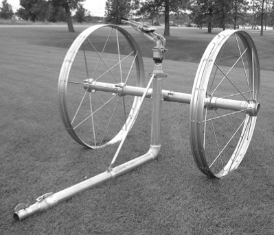 5057-4 - Big Gun Cart Assembly, Standard Profile, 57" Wheel, 4" Male Inlet.  84" long, 4" diameter axle and two heavy duty galvanized wheels. Clamp on 4" diameter aluminum riser...